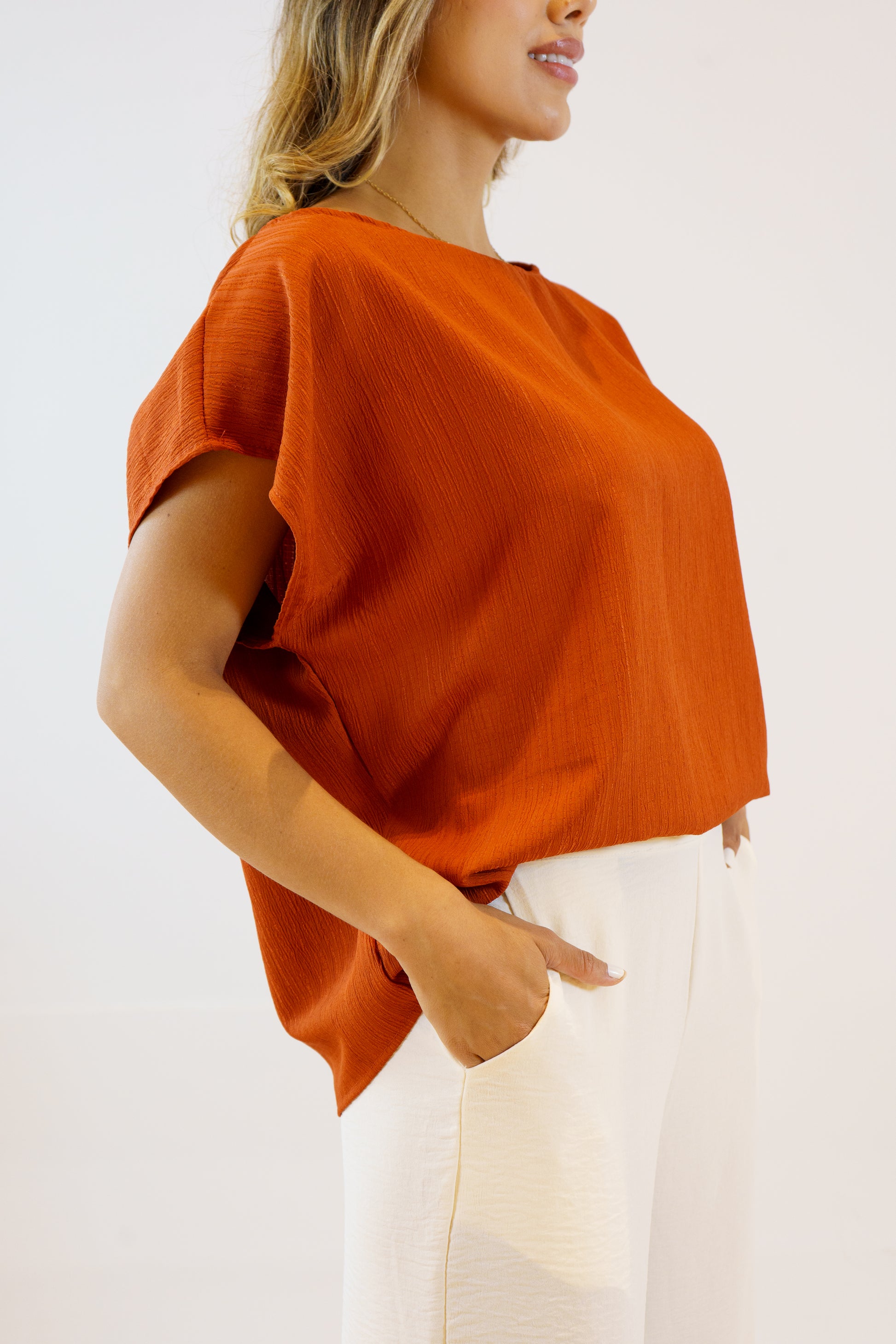 La blusa Isabella en color ladrillo está confeccionada con tela Uyuni, que ofrece una textura suave y un acabado elegante. Su tono cálido y sofisticado aporta un toque de distinción, mientras que su diseño cuidado garantiza comodidad y estilo para cualquier ocasión especial o evento formal.