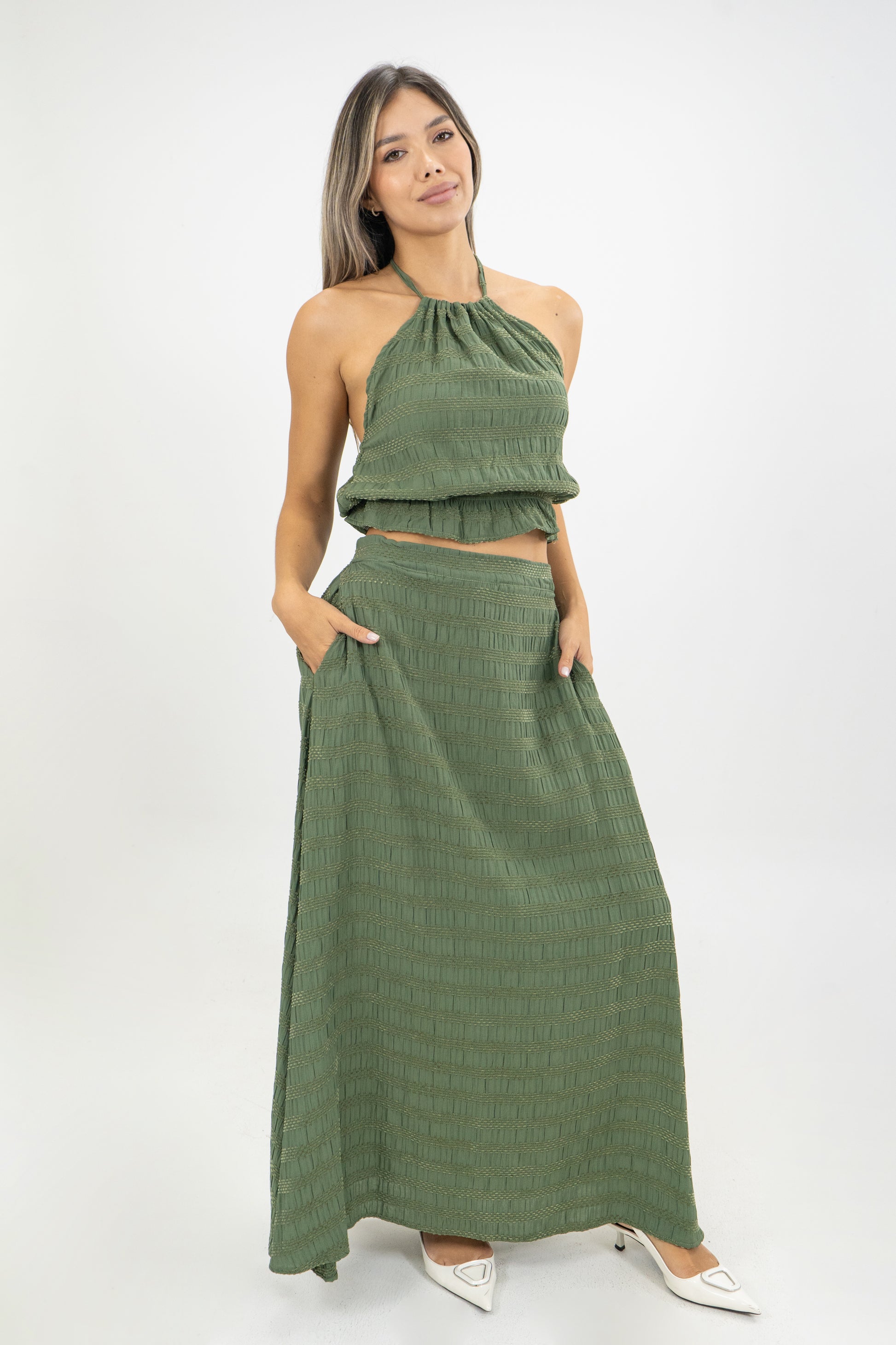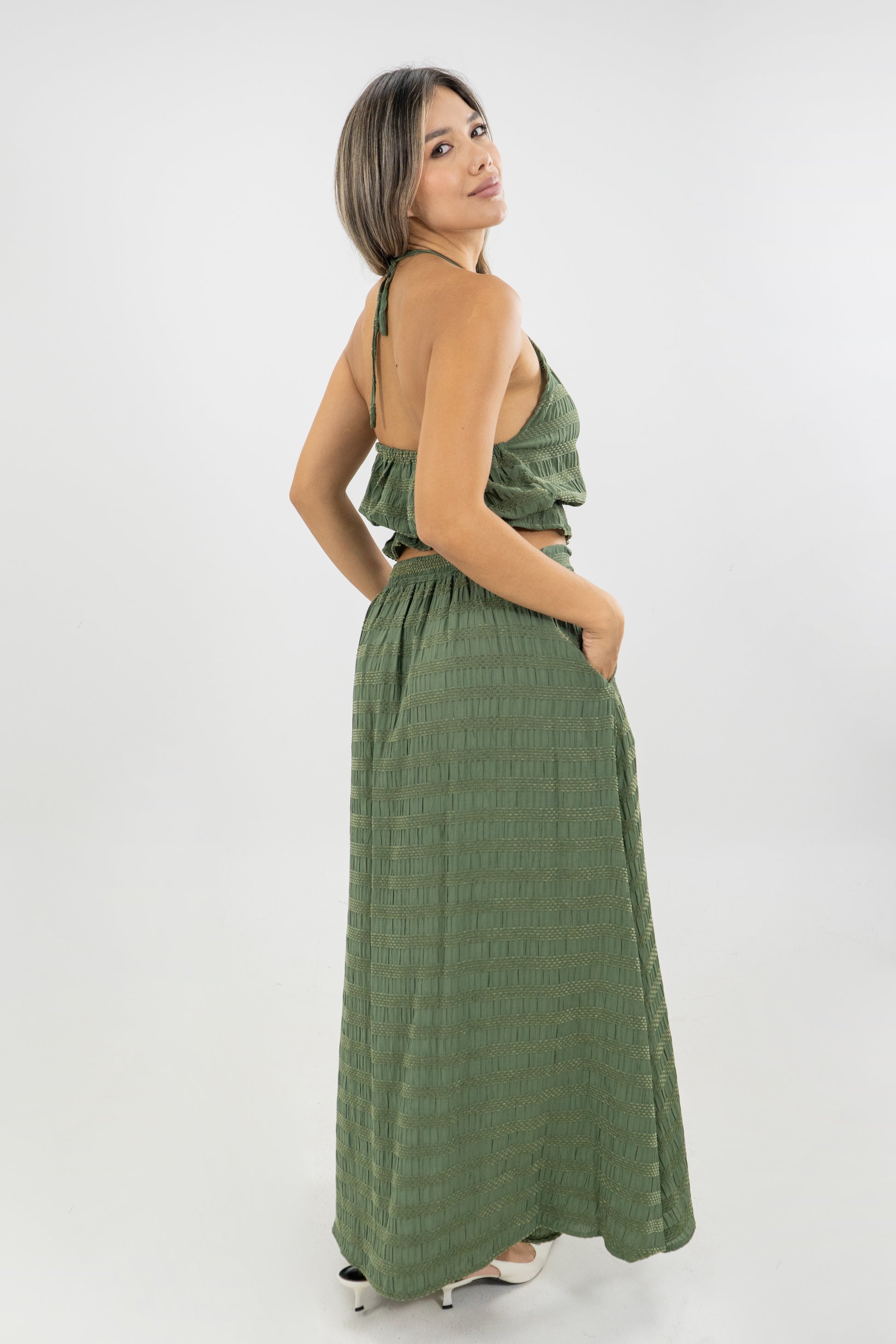 El Top Uma refleja la femineidad moderna y la elegancia relajada que define la colección Palmarias. Confeccionado en una base de tela Gypsy, ofrece una textura suave, elástica y envolvente que se adapta al cuerpo con delicadeza. Su diseño combina líneas minimalistas y cortes sutiles, destacando la silueta con naturalidad y sofisticación. Perfecto para crear conjuntos versátiles, el Top Uma puede lucirse tanto en un look casual de día como en una propuesta más refinada de noche. Inspirado en la fluidez y armonía de la naturaleza tropical, esta pieza encarna la esencia de Sofisticadas: una mujer que irradia confianza, gracia y estilo auténtico.