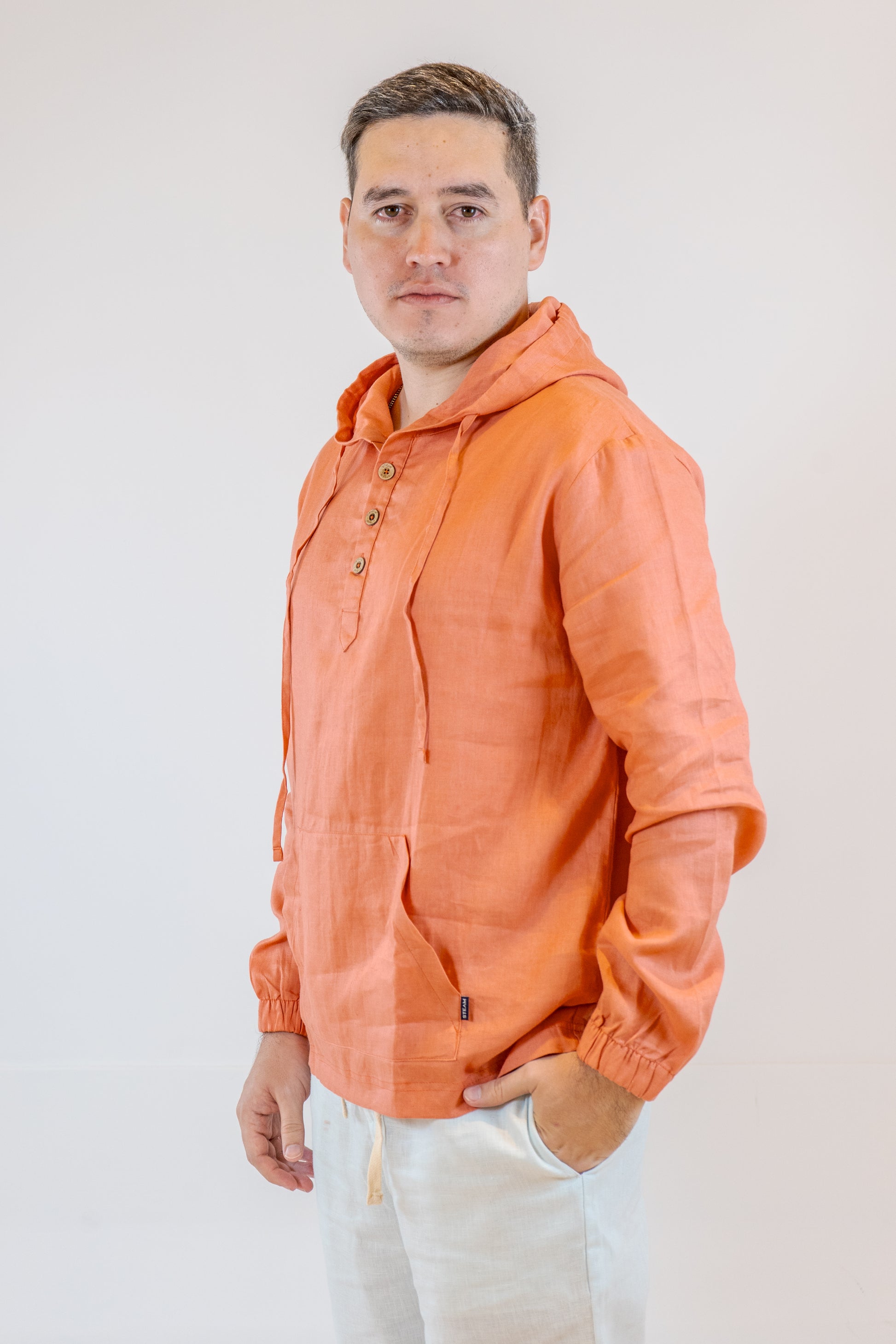 Este hoodie de manga larga en tono ginger está confeccionado en tela lino, que aporta una textura suave y transpirable para un confort superior. Su diseño sofisticado combina la comodidad casual con un estilo refinado, ideal para quienes buscan una prenda versátil que destaque por su elegancia natural y frescura.