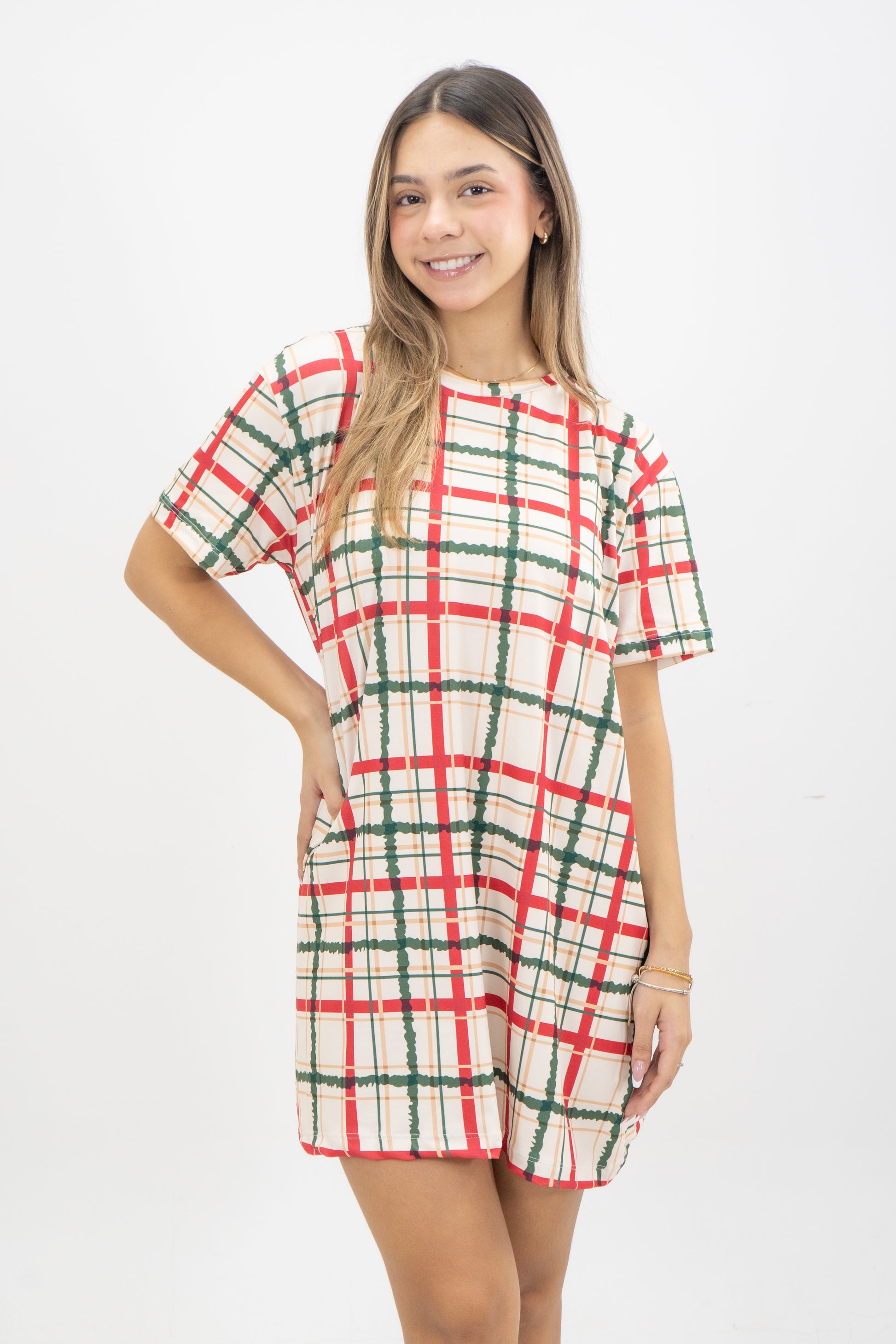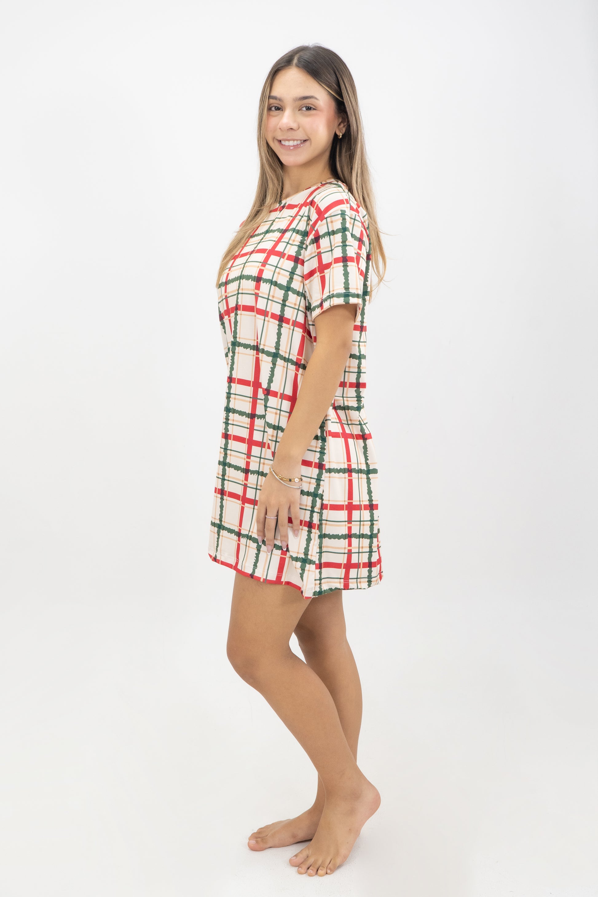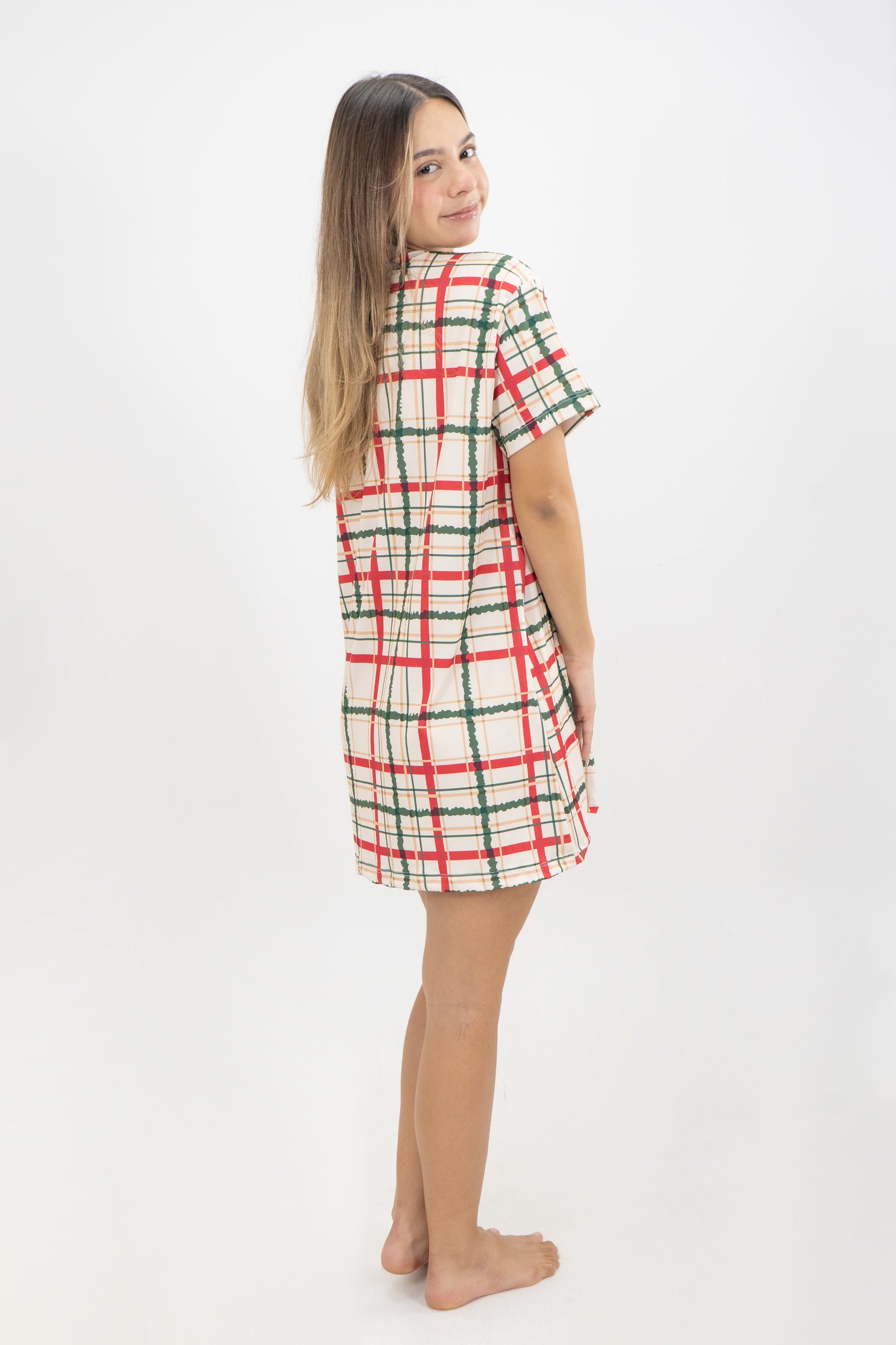 Cómodo y encantador camisón navideño de una sola pieza, con un estampado completo de Papá Noel, pinos y regalos sobre fondo rojo. Su silueta amplia y ligera brinda total libertad de movimiento y una sensación fresca ideal para dormir o disfrutar momentos de descanso en casa. Perfecto para vivir la Navidad con estilo y comodidad.