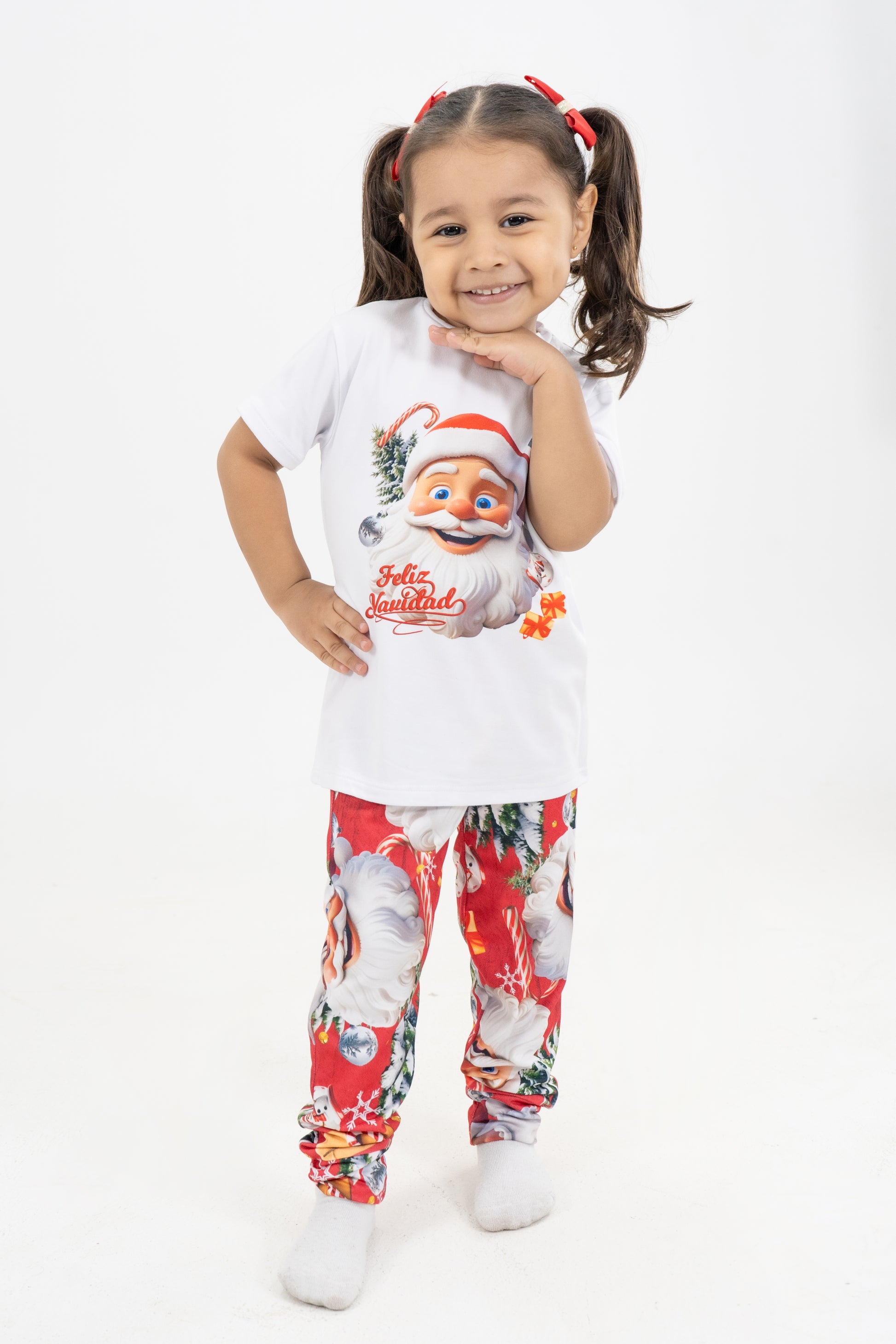 Disfruta la magia de la temporada con esta pijama navideña dedos piezas, compuesta por una camiseta blanca estampada con Papá Noel y un pantalón largo rojo con el mismo diseño festivo. Confeccionada en telas suaves y frescas, ideal para noches cómodas y llenas de espíritu navideño. Su estampado de Santa, regalos y pinos la convierte en la opción perfecta para compartir en familia y celebrar con estilo.