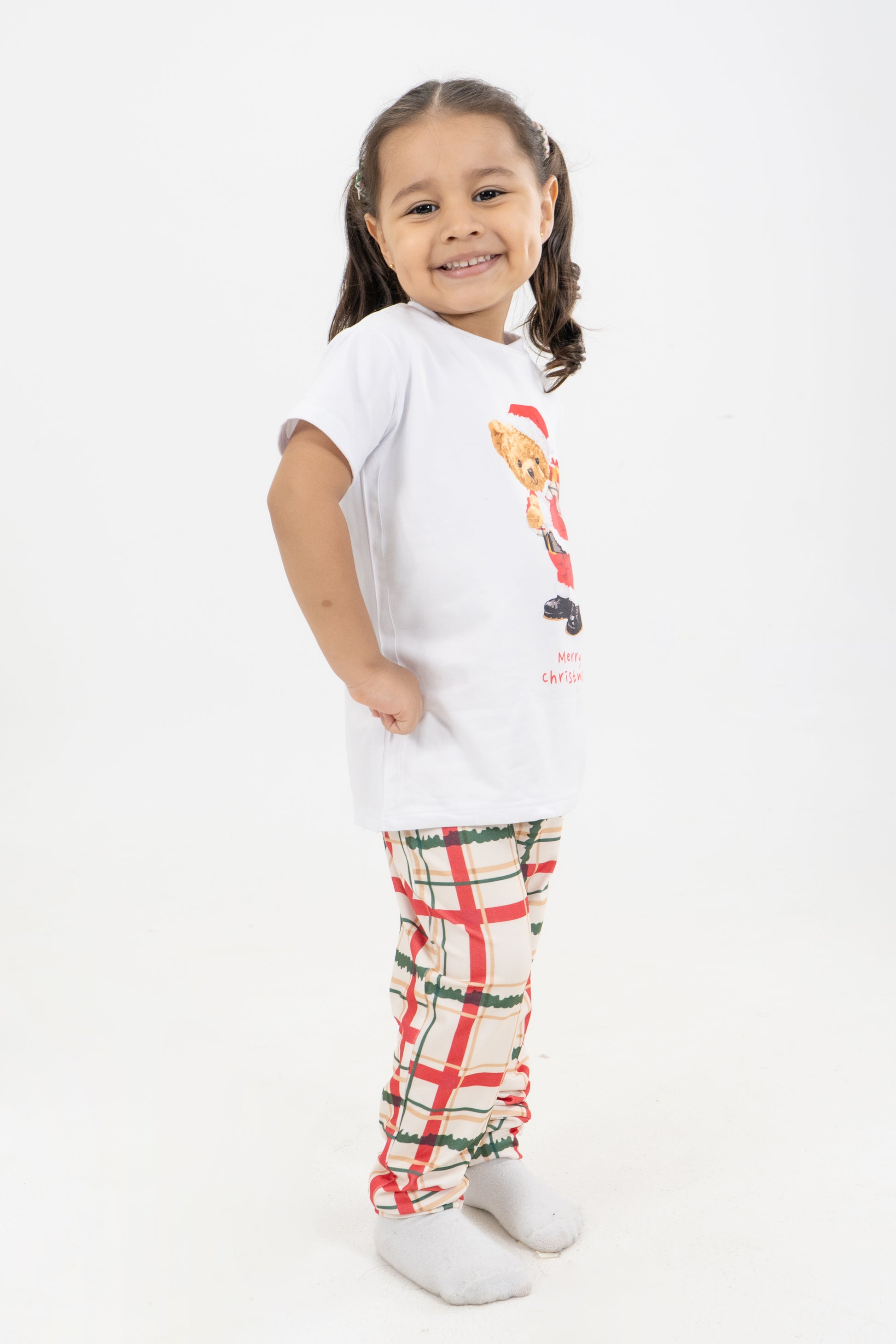 Disfruta la magia de la temporada con esta pijama navideña dedos piezas, compuesta por una camiseta blanca estampada con Papá Noel y un pantalón largo rojo con el mismo diseño festivo. Confeccionada en telas suaves y frescas, ideal para noches cómodas y llenas de espíritu navideño. Su estampado de Santa, regalos y pinos la convierte en la opción perfecta para compartir en familia y celebrar con estilo.
