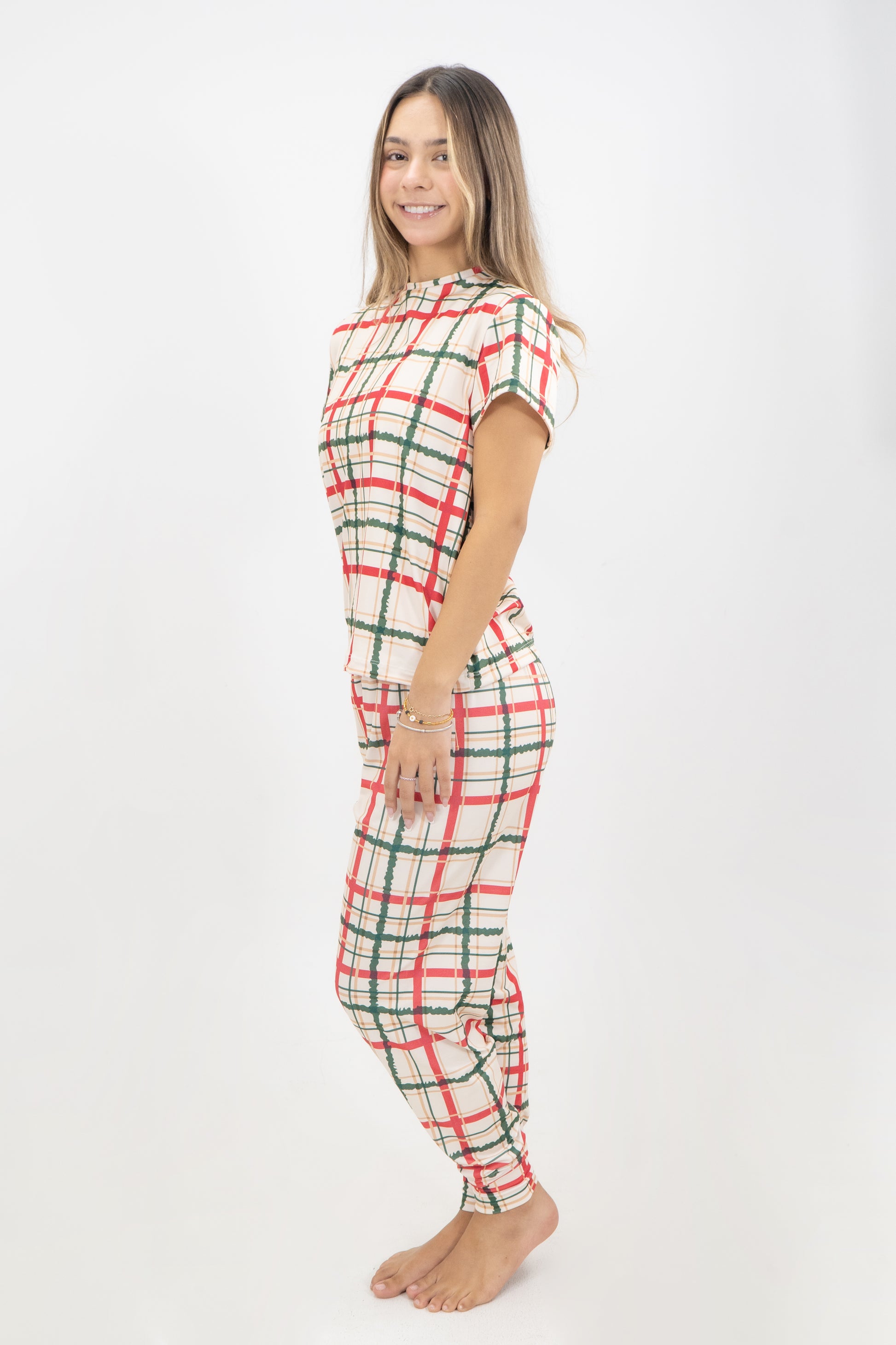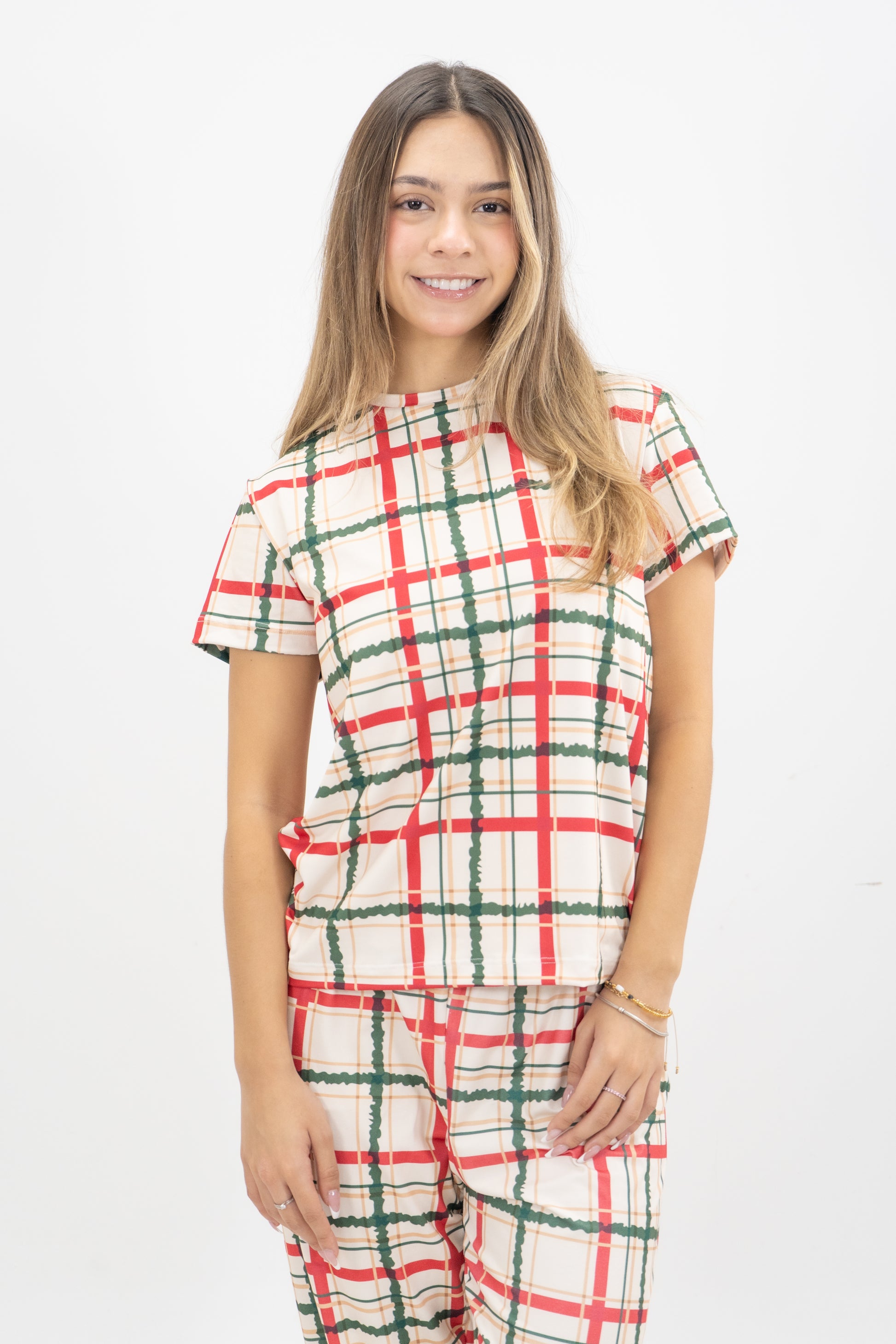 Sumérgete en el espíritu navideño con esta pijama de dos piezas, compuesta por camiseta y pantalón largo totalmente estampados con motivos de Papá Noel. Su diseño alegre en tonos rojos con detalles de pinos y regalos crea una apariencia festiva y divertida. Confeccionada en tela suave y fresca, perfecta para descansar o disfrutar de las celebraciones con total comodidad.