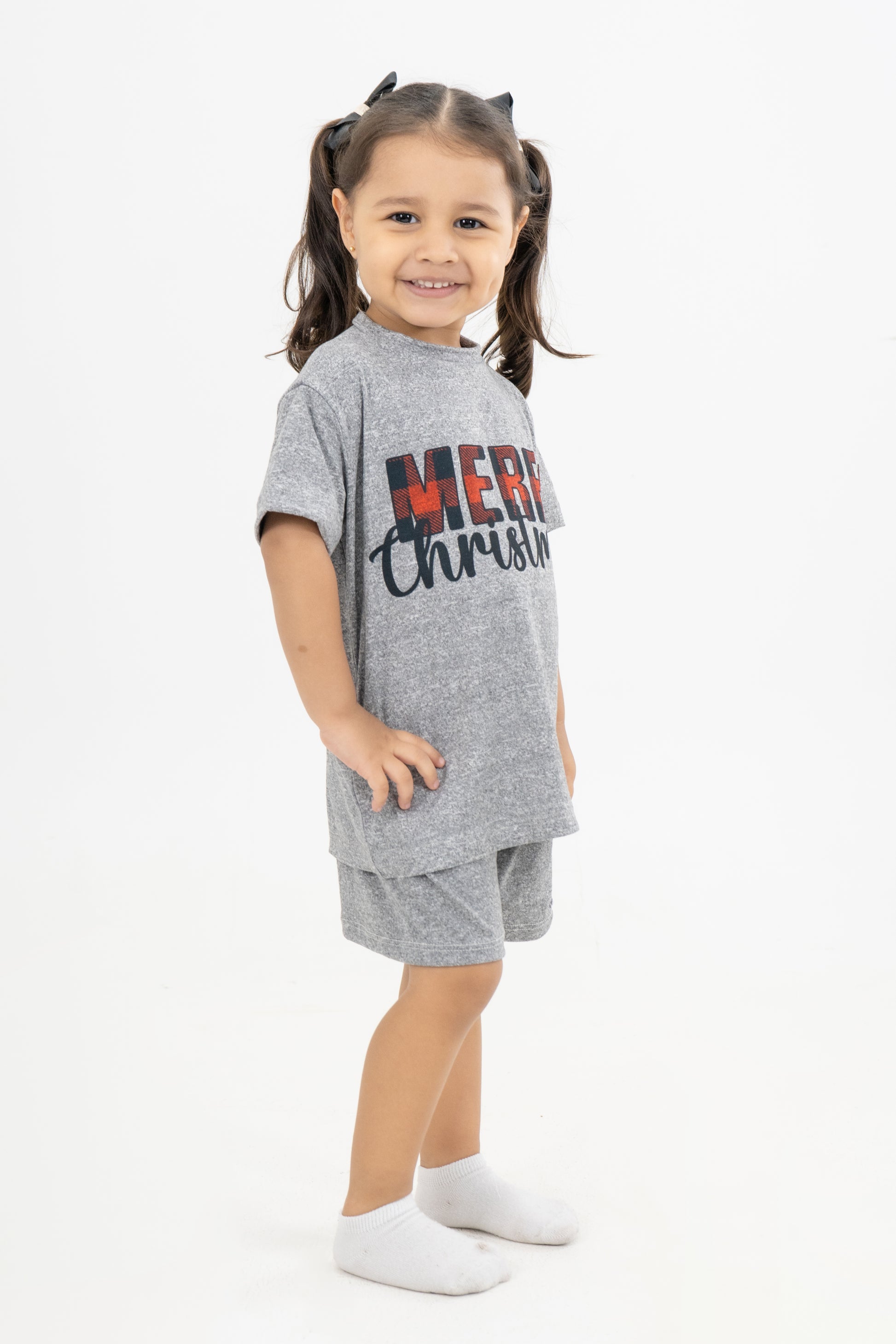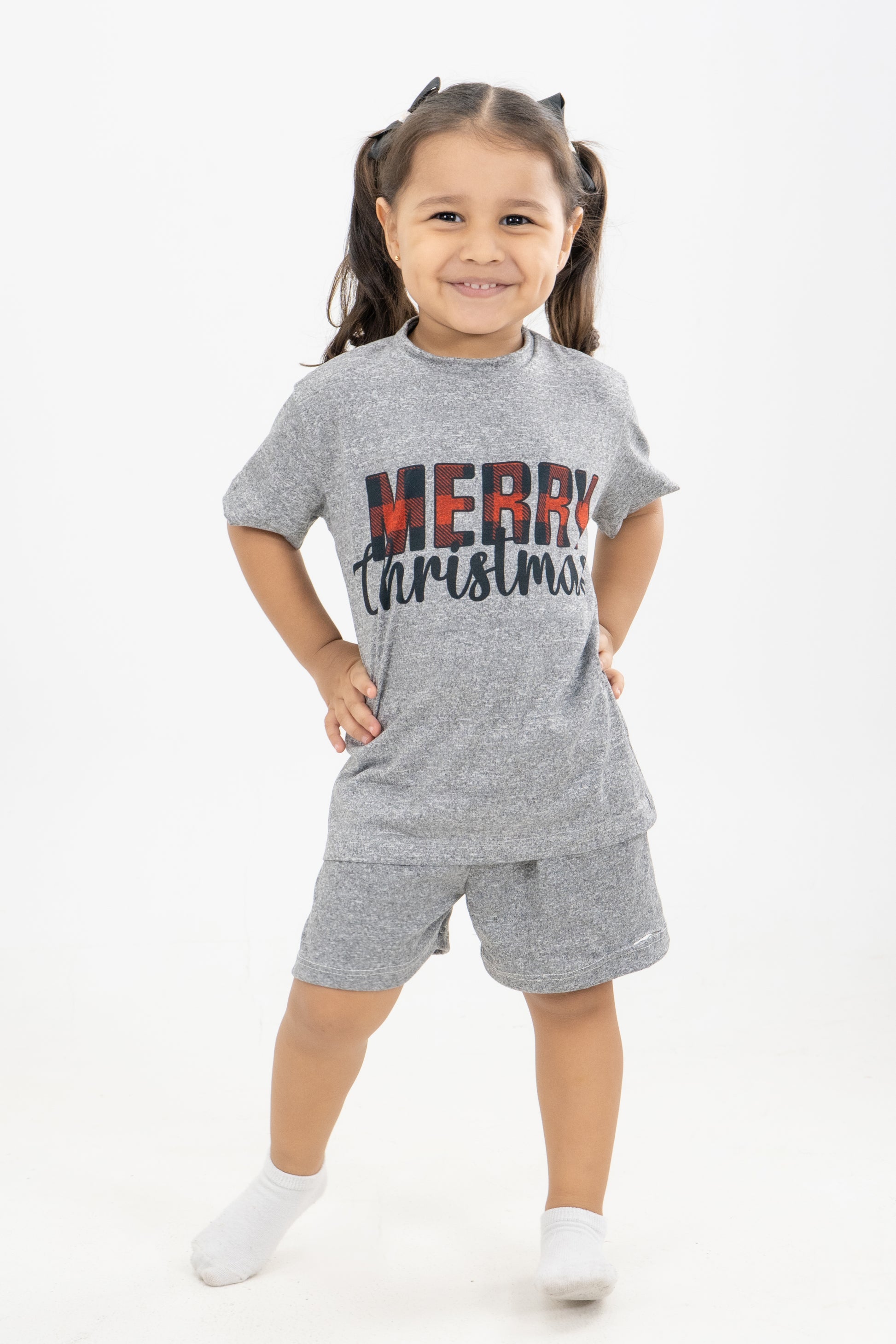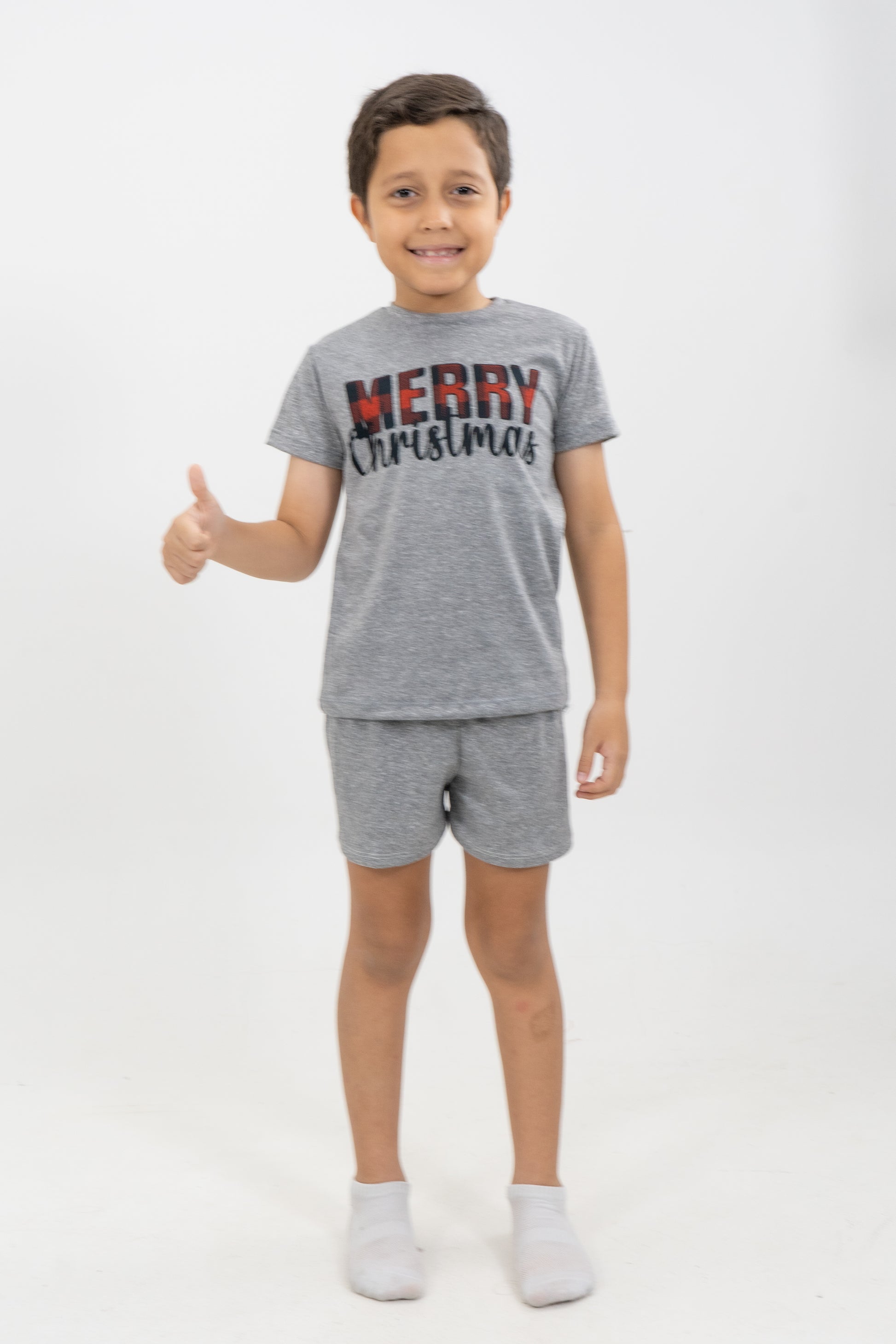 Pijama de dos piezas en tono gris jaspe, con camiseta estampada “Merry Christmas” en letras rojas tartán y negras, combinando el espíritu navideño con un estilo moderno y minimalista. Su tela es suave, ligera y elástica, ideal para noches frescas o para descansar cómodamente en casa. El short de pretina elástica complementa el look con una silueta práctica y relajada.